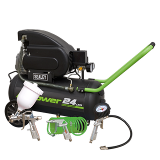 • Air Displacement: 6.8cfm(193L/min). • Maximum Free Air Delivery: 4.6cfm(130L/min). • Maximum Pressure: 116psi(8bar). • Aluminium cylinder head with cast iron cylinder gives added resistance to wear. • Copper wound motor provides longer lasting performance. • Suitable for general-purpose workshop applications. • Pump head directly coupled to heavy-duty induction motor for reliable and quiet operation. • Precision welded receiver tank manufactured to meet Pressure Vessel Directive. • Fitted with fully automatic pressure cut-out switch and twin gauges displaying tank and working pressures. • Includes 4pc multipurpose air accessory kit. • Fitted with 3-pin plug.