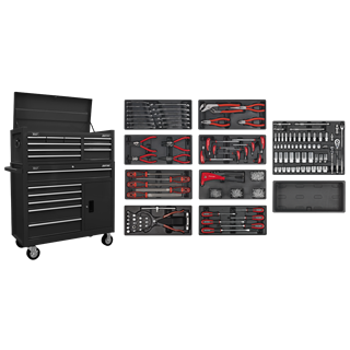 • BUILT-TO-LAST – Manufactured from double skin side walls. • SECURITY – Topchest and Rollcab both fitted with a cylinder lock and locking bar to secure drawers. Supplied with four keys. • WORKSHOP READY – Coated in high-gloss triple baked enamel for protection against oil, dirt and mild solvents. • MANOEUVRABILITY – Rollcab fitted with four Ø5″ x 2″ castors, two fixed and two swivel with brakes and a powder coated side handle. Package includes: • AP4106HV – Rollcab 6 Drawer – Green • AP4109HV – Topchest 9 Drawer – Green • TBT01 – Combination Spanner Set 13pc Metric • TBT02 – Pliers Set 4pc • TBT03 – Circlip Pliers Set 4pc • TBT06 – T-Handle Ball-End Hex Key Set 8pc • TBT09 – Engineer’s File Set 5pc • TBT15 – Riveter & 400 Assorted Rivet Set • TBT28 – Oil Filter Wrench, Pliers & Drain Plug Set • TBT29 – Hammer-Thru Screwdriver Set 6pc • TBT31 – Socket Set 55pc • TBTB – Tool Tray – Blank • 2 Year Guarantee*.