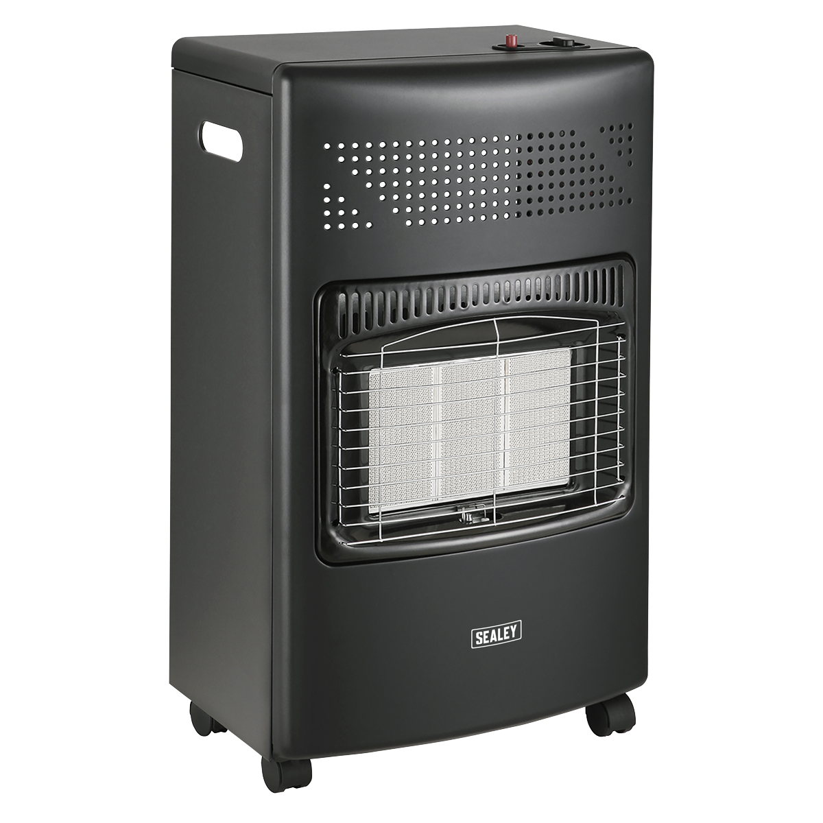 • EASY TO USE – For convenience and ease this ceramic plaque cabinet heater comes complete with a regulator and hose that fits easily to a 15kg Butane bottle (not included). Ideal for a home or office environment. • PIEZOELECTRIC IGNITION – Piezoelectric push-button ignition system allows for trouble free start up. • EFFECTIVE OUTPUT – With three heat settings the output ranges from 1.55 to 4.2kW (5,288 to 14,330Btu/hr). • SAFETY – Features flame failure device, anti-tilt switch and oxygen depletion system. • PORTABLE – No power supply required, the 15kg Butane bottle (not included) fits comfortably into the rear of the unit and can be manoeuvred into any desired area on its 4 supplied wheels.