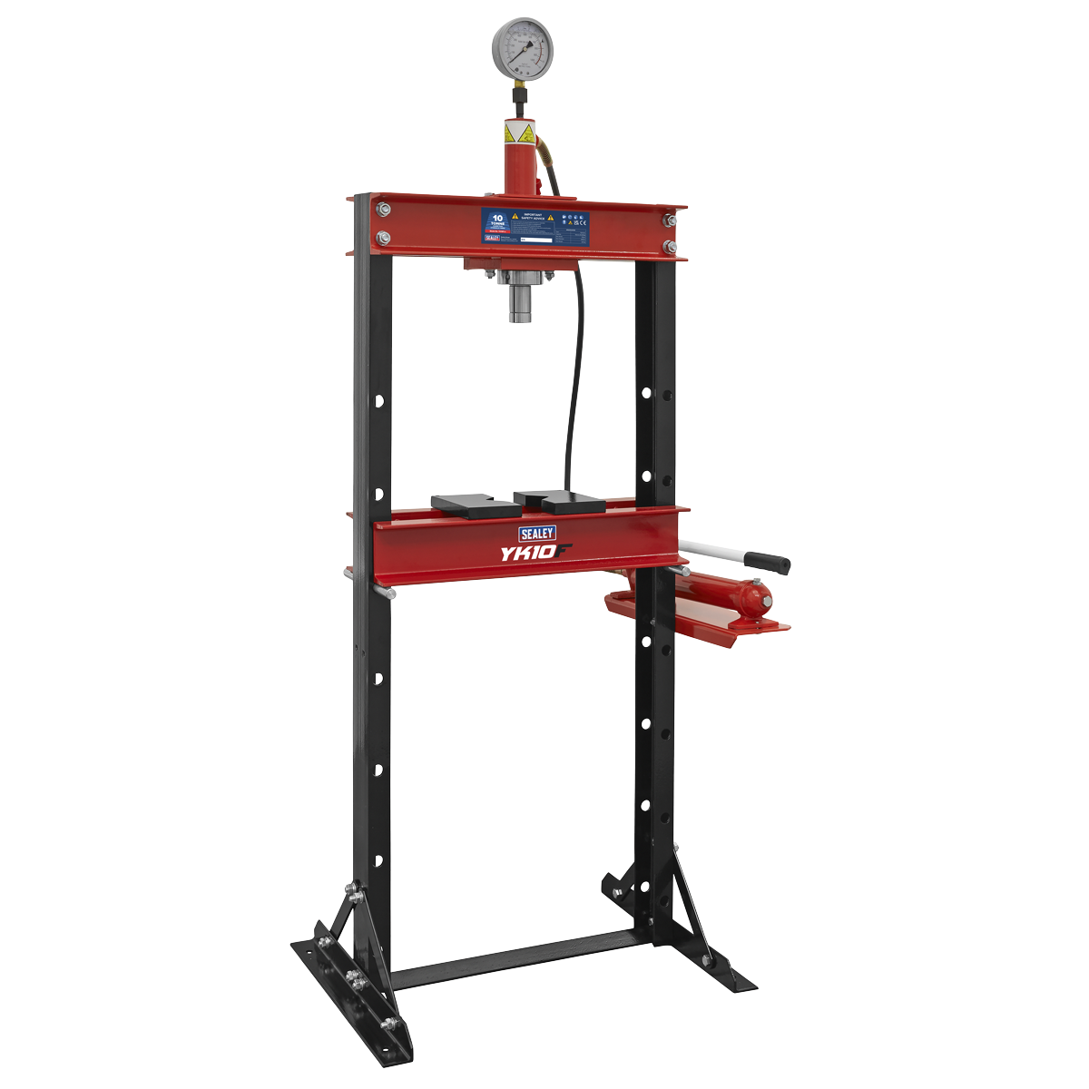 • Made from high quality steel with a powder coated paint finish to help corrosion resistance. • Detachable pump and ram allowing hydraulics to be used for other purposes when press is not in use. • Includes 2 table plates. • Supplied with gauge.