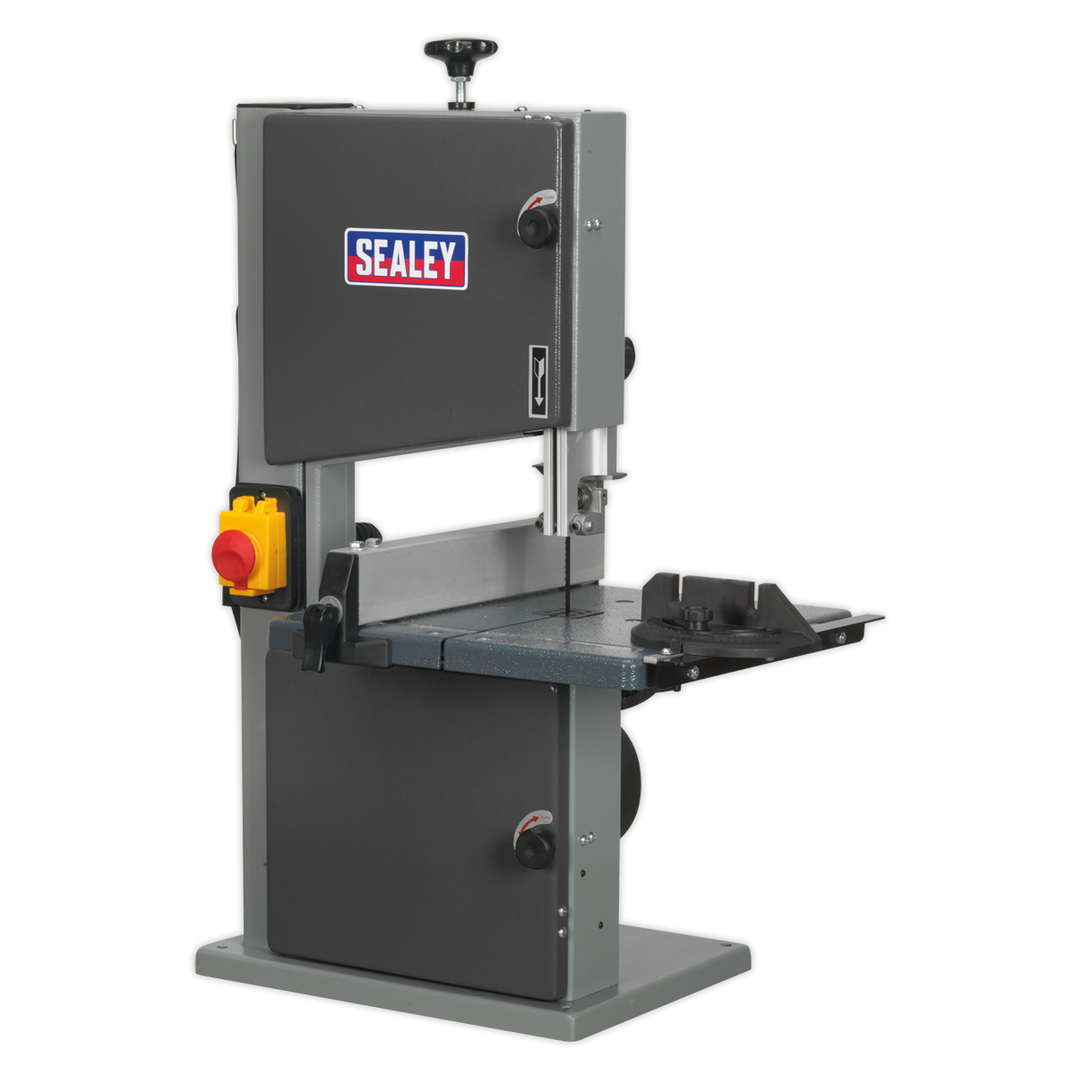 • Fully approved to current CE directives. • Steel chassis with locking blade wheel covers. • Bearing-mounted blade wheels and direct drive induction motor provide smooth operation. • No-volt release switch prevents uncontrolled blade restart after power interruption. • Suitable for cutting wood and plastics. • Fitted with tilting table for cutting compound mitres. • Fitted with blade wheel brush to prevent dust accumulation and enhance blade life. • Features quick adjusting rip fence, mitre gauge, push stick and dust extraction port. • Throat Depth: 200mm. • Max. Cutting Height: 80mm. • Dust Extraction Diameter: Ø40mm.